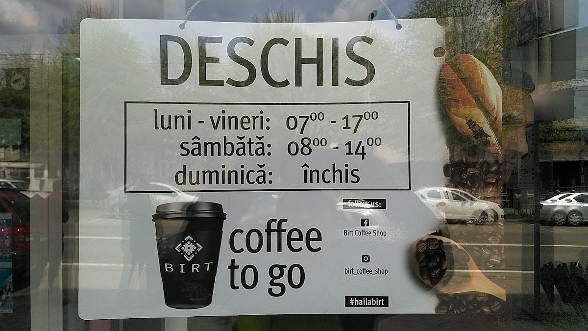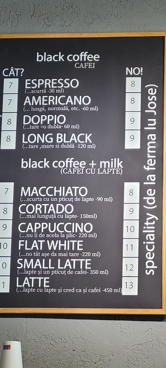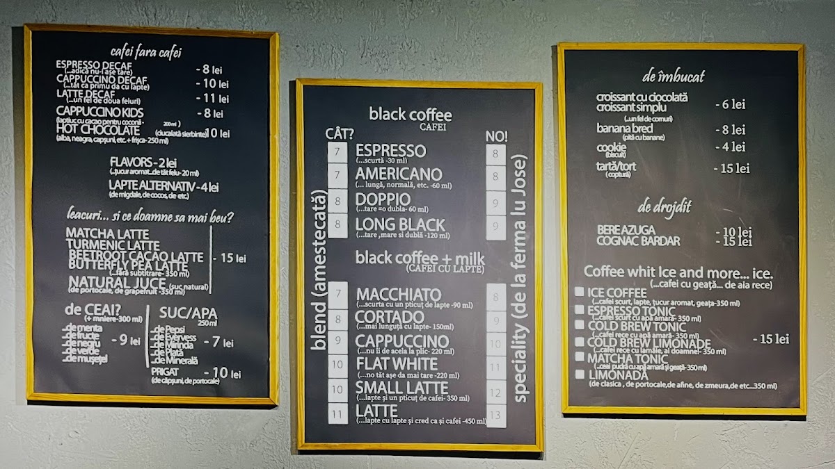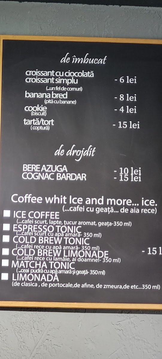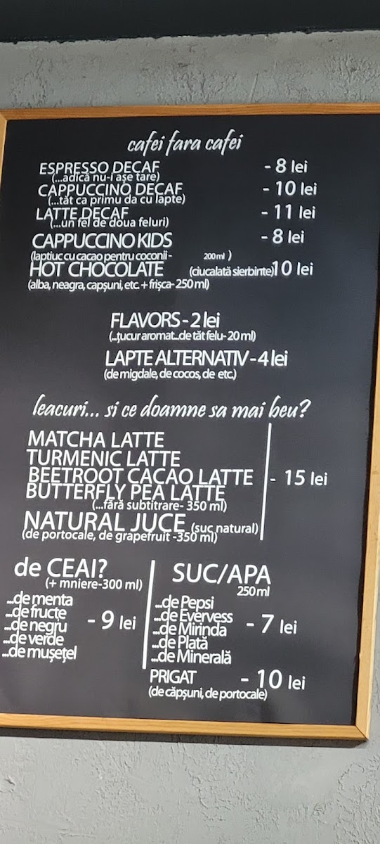 The menu offers a selection primarily focused on coffee and other beverages suitable for various times of the day, including morning hours and coffee breaks. Visitors can find a range of coffee drinks such as espresso-based options, with highlights including caffe latte and specialty items like limonada cu sirop de capsuni (lemonade with strawberry syrup).